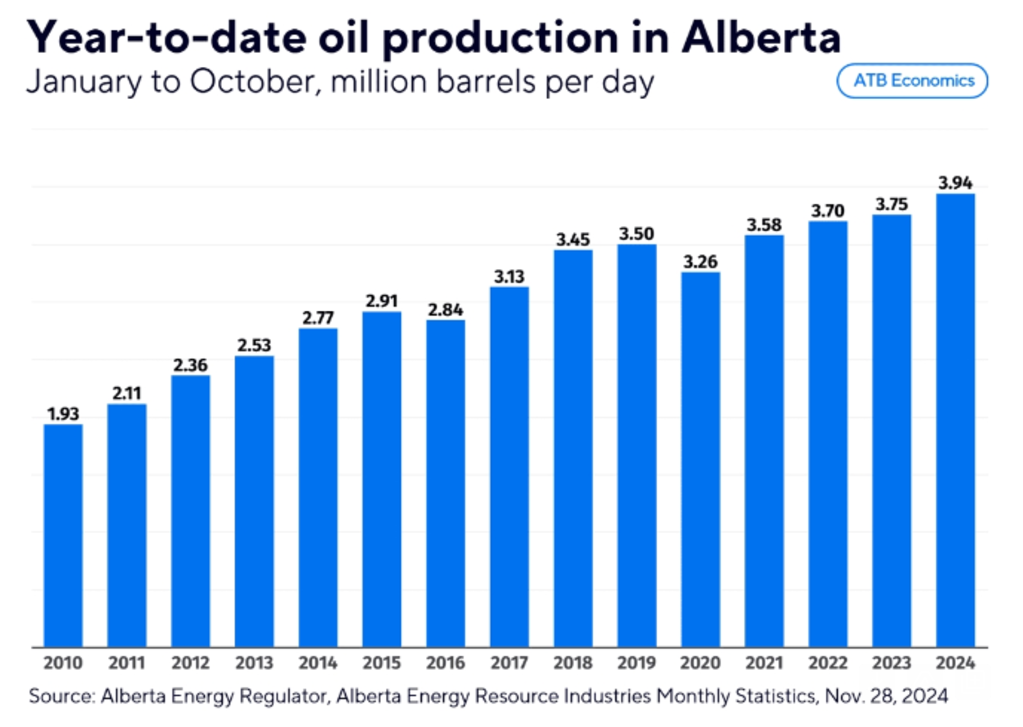 Energized: Oil prices are up nearly 2% ahead of a crucial OPEC+ meeting Thursday. Recall, members were supposed to start increasing production. However, oil prices have come under renewed pressure and members are now reportedly working on another 3-month extension to production curbs. While OPEC is trying to keep a lid on oil production, worth noting that Alberta has been going full steam. Year-to-date production is at a record high, according to ATB Capital. “With President-Elect Trump proposing a 25% tariff on Canadian goods last week, it’s extra notable that Alberta broke yet another oil production record because the main market for that oil is the United States,” ATB wrote.