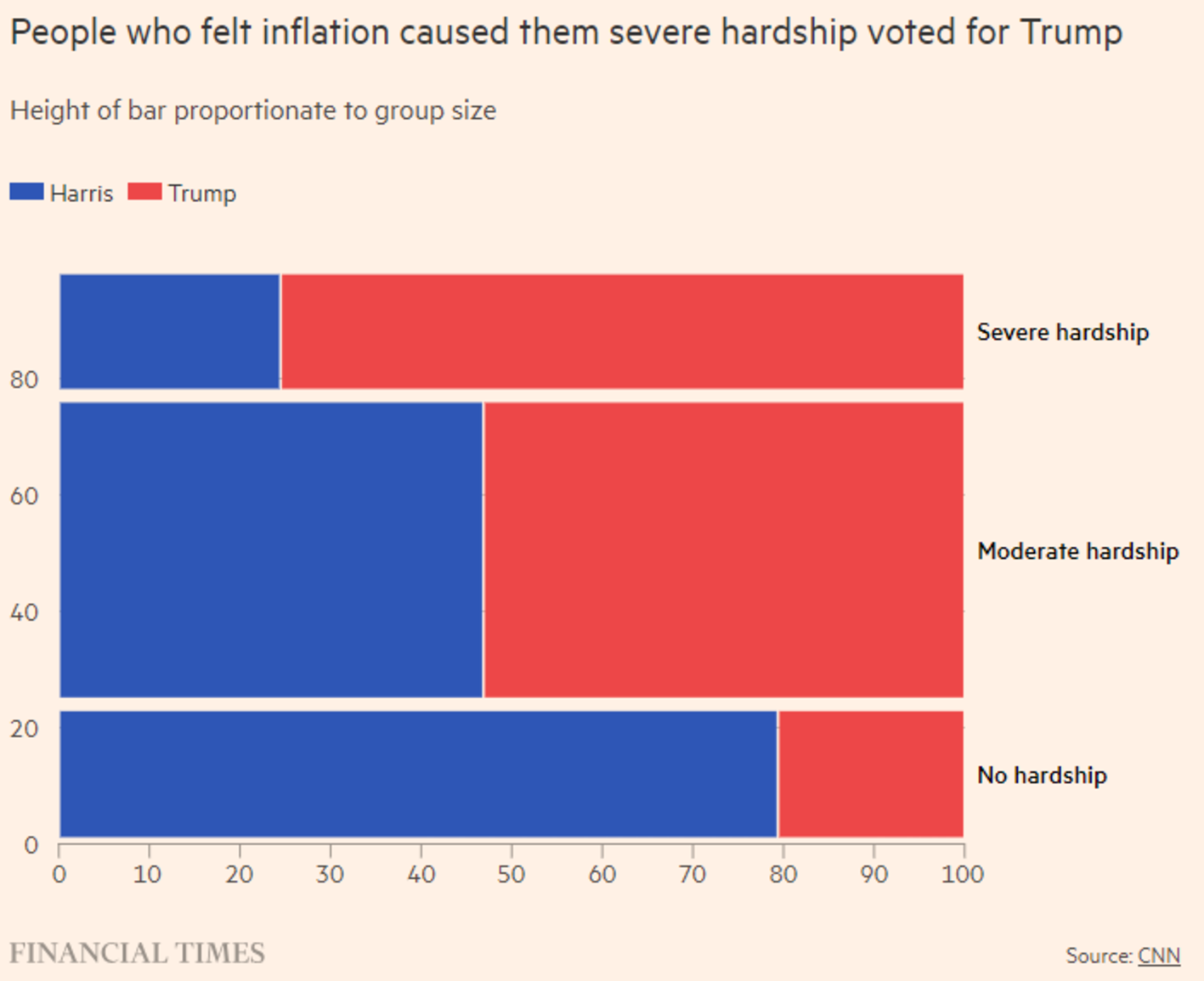 Genie is out: Inflation in Canada picked up for the first time in five months. The Consumer Price Index for October increased 2%, higher than the 1.6% gain in the previous month. To make matters worse, core inflation also picked up. Recall, October was when the Bank of Canada made its jumbo 50 basis point rate cut after cutting rates three times prior. This likely reduces the odds of another jumbo cut. But also has potential political implications. As pundits try to unpack what happened in the US election a few weeks ago, the data is making it clear that inflation was top of mind for voters (see chart below). And perhaps a harbinger of things to come in Canada if leaders don’t take steps to bring down prices.