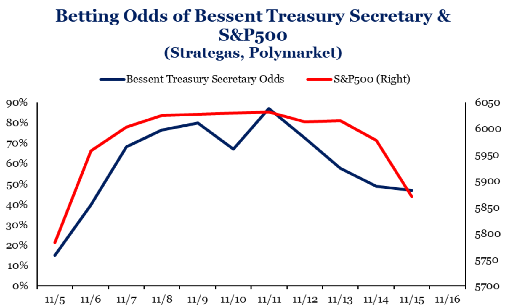 Round trip: US markets are back to where they were before Donald Trump got elected. There are all sorts of reasons for this unwind: stretched valuations, typical sell-the-news behaviour, and a more hawkish tone from the Federal Reserve. A few hedge fund managers claim there is another reason: tensions about who will be the next Treasury Secretary. Right now, it is a face-off between Scott Bessent (CEO of Key Square and Trump advisor) and Howard Lutnick (CEO of Cantor Fitzgerald and key Trump fundraiser). Hedge fund manager Kyle Bass over the weekend said Bessent is “eminently more qualified than Howard Lutnick to run the US Treasury.” Elon Musk retorted that Bessent “is a business-as-usual” candidate and prefers Lutnick. Bass suggested the reason the market is selling off is because the odds of Bessent becoming Treasury Secretary are falling (see chart). As I said, there is a laundry list of reasons why the markets pulled back last week. This is possibly one of them. This morning, futures are mixed. Tesla’s strength is helping to offset weakness in Nvidia. Nvidia shares are down because The Information is reporting their new AI chips are causing servers to overheat. Gold is rising for the first time in seven sessions, even while the US dollar is still rallying. This week we get Walmart (Tuesday) and Nvidia (Wednesday) reporting results. In Canada, we get inflation tomorrow and retail sales on Friday.