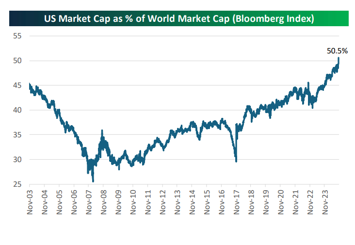 US exceptionalism: If it feels like the US markets are taking up a lot of ink these days, it is not your imagination. Here are three stunning charts that show how dominant the US markets have become as they are poised to put in back-to-back 20% annual moves. The US market cap as a percent of world market cap is now over 50% for the first time since Bloomberg started tracking the data in the early 2000s. “The US Continues to eat the world when it comes to stocks,” notes the folks at Bespoke Investment Group.