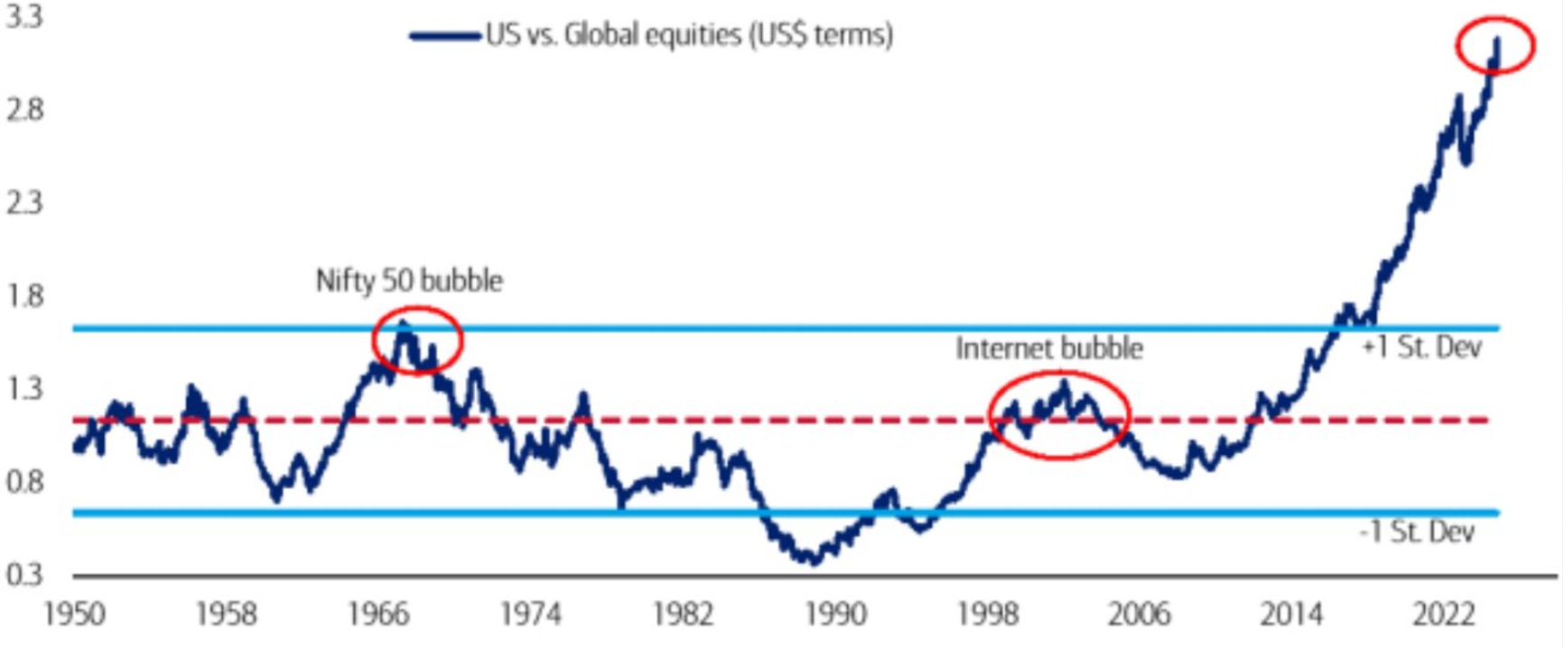 Magnitude of US outperformance relative to global stocks (via Sara Eisen, CNBC)