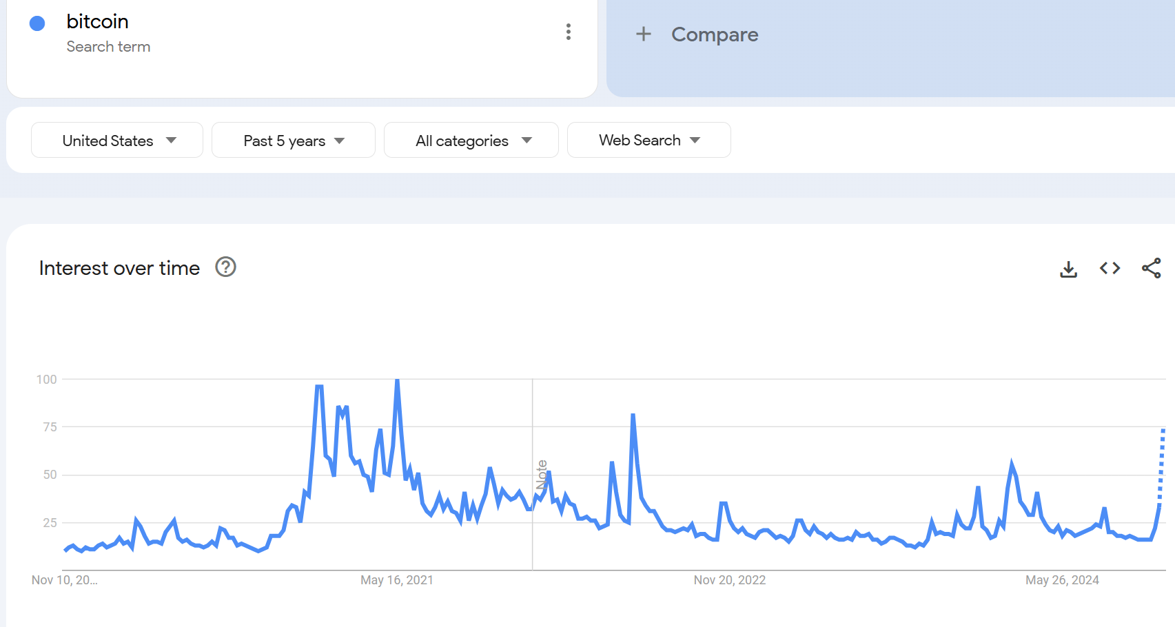 Flippening: Bitcoin is nearing $90,000 and now sports a market valuation of $1.7 trillion. It is getting harder to ignore. In fact, if it was in the S&P 500 it would be the 7th most valuable company. It is now more valuable than Meta, JP Morgan and Berkshire Hathaway. And it is not just Bitcoin. Elon Musk’s fan favourite Dogecoin is now worth more than Newmont Gold (the world’s most valuable gold mining stock), Ford, and General Mills. Institutions are starting to notice. Yesterday morning, Bernstein’s head of crypto research reportedly said investors should “buy everything you can.” It is that kind of euphoria that can make the skeptics take pause. Indeed, Bitcoin’s own Fear & Greed Index now says we are in Extreme Greed territory. However, since this is such a retail driven market I took a look Google search interest. As you can see below, while it is poised to perk up, we are well off the interest levels back in 2021.