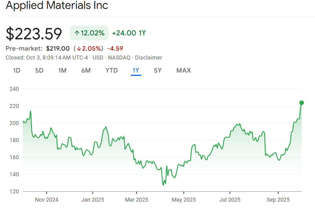 Applied track: Shares of Applied Materials are falling 2% after warning of a $600 million sales hit. The semiconductor equipment maker said sales will take a hit next year because of a new rules in the US that expand restrictions on what can be shipped to China. The stock has been on a tear lately, but analysts say the reduction is manageable. Citi estimates this is just a 2% hit to overall revenue. Bernstein’s Stacy Rasgon calls the update “annoying” but “mostly incremental.” Watch for warnings from peers like LAM research and KLA Corp.