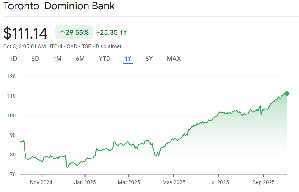 I like you when you’re high: TD is getting an upgrade from RBC following its investor day this week. “TD announced a significant incremental (share buyback) and cost savings targets at its 2025 investor day which were more than we had anticipated,” wrote RBC’s Darko Mihelic in the upgrade. While TD is now trading at record highs, Mihelic thinks it could go higher and has a $120/share price target implying 12% upside from here. Mihelic acknowledges TD is trading above its historic earnings multiple, but says higher capital return and better cost controls should drive valuation higher. On the flip side, RBC is downgrading BMO to hold mostly because they see limited upside to valuation. “We see valuation upside difficult to attain without further improvement in ROE and higher EPS, which we believe may happen but likely beyond 2027,” wrote Mihelic. BMO has been the second best performing major bank stock after TD so far in 2025, acknowledges Mihelic, but has the least room for additional buybacks he argues.