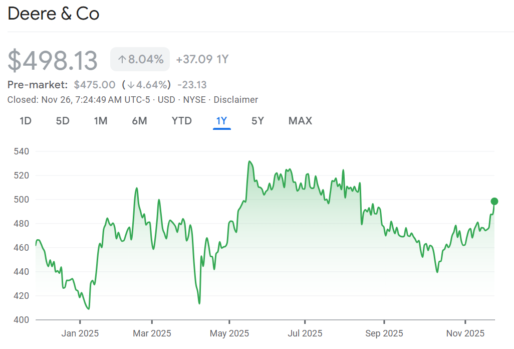 Trouble on the farm: Deere is falling 4.6% in the pre-market after its sales forecast fell short of expectations. The farm equipment maker said they believe 2026 will mark the bottom of the large agriculture sector. They are warning that unit will likely see sales fall 15-20% in 2026. Farmers have been struggling with lower crop prices and tariffs under US President Donald Trump. This leaves them with less excess cash to buy things like new tractors.