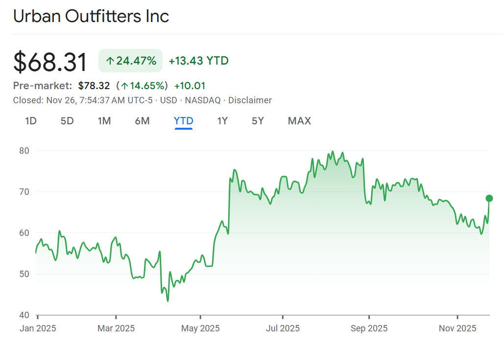 Style files: Urban Outfitters is surging 15% joining peers like Abercrombie & Fitch and Kohl’s with strong sales. Urban Outfitters saw comparable sales increase 8%, better than the 5% expected. The stock isn’t coming off a low base, it is poised to hit a record high at the open.
