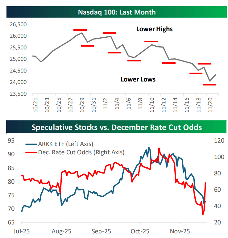Keeping hope alive: Futures having some pep in their step after comments from NY Fed Governor Williams on Friday in which he said there is room for a rate cut near term. Williams word carries more weight than others and his comments were seen as de facto message from Fed Chair Jerome Powell himself. Odds of a December rate cut shot up to 70% and helped to support a Friday rally. Still, quite a bit of damage has been done. Particularly to the NASDAQ which is down 6% so far in November. The first chart below from Bespoke suggests a trend breakdown. However, if a rate cut materializes, the sector could see a bounce (see second chart). This morning, Alphabet (+4%) is propping up the the tech sector after the roll out of Gemini 3 – its answer to ChatGPT – was seen as higher functioning than other LLMs. Salesforce CEO Mark Benioff tweeted he is so impressed he will never go back to ChatGPT.