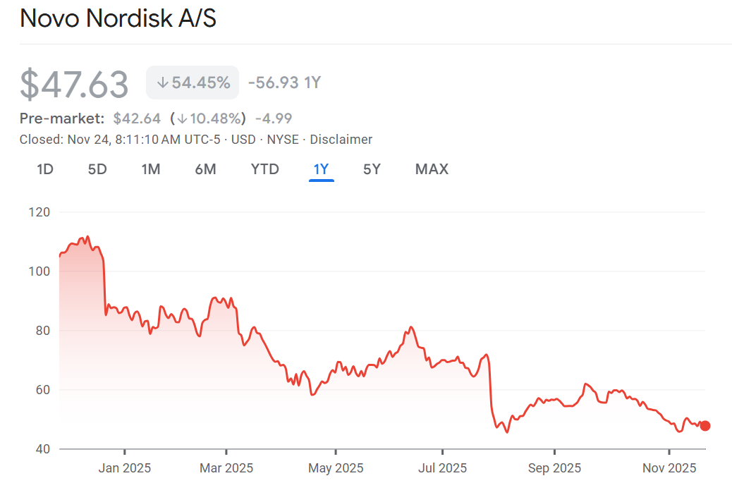 Race to cure Alzheimer’s: Novo Nordisk is plunging 10% after its Ozempic pill failed to halt the progression of Alzheimer’s in clinical trials. This was viewed as a key catalyst for the stock which has fallen badly behind Eli Lilly. Shares of Novo are poised to open at a 4-year low. Meanwhile Eli Lilly recently joined the $1 trillion dollar club and shares are up 40% over the past year. Novo’s loss is Biogen’s win as it keeps their Alzheimer’s treatment in pole position and the stock is trading up 5% in the pre-market. RBC believes this should clear the way for Biogen to start to outperform. ” BIIB has continued to trade at a discount to what we believe is fundamental fair value, we believe in part due to the overhang around this GLP-1 Alzheimer’s data, and with the evoke studies now out of the way, we believe this gap can start to close into what we expect will be a more eventful 2026,” wrote RBC’s Brian Abraham.