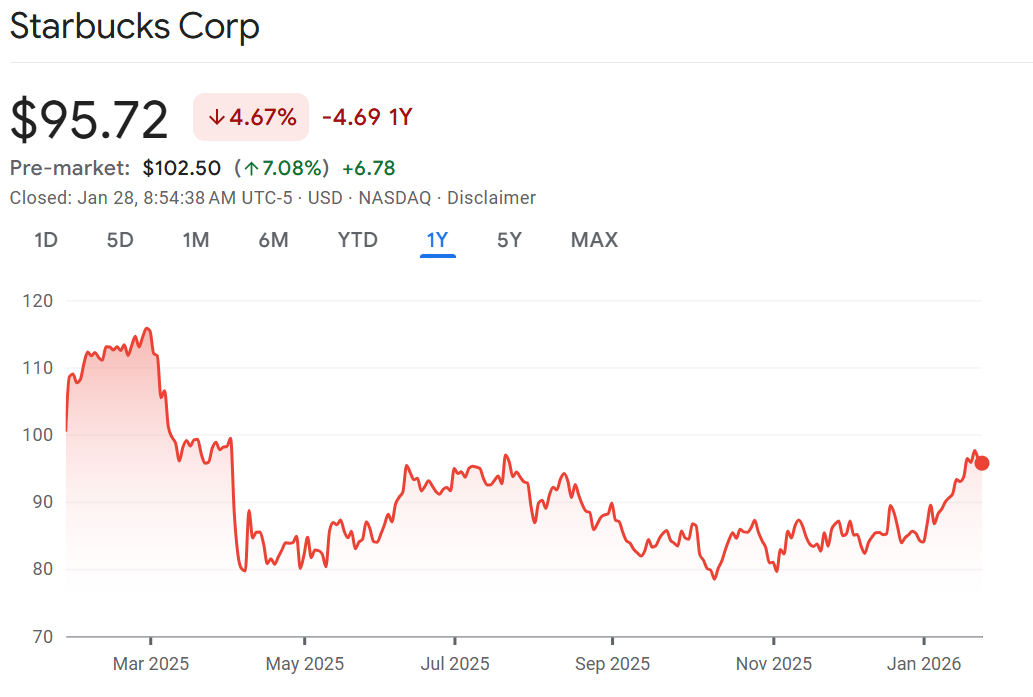 Venti: Starbucks is surging 7% in the pre-market after comparable sales in the quarter blew past estimates giving investors comfort that the turnaround under Brian Niccol is underway. Profit missed expectations, but investors are willing to look past that as Starbucks gave a rosier outlook than expected. This is the first time Starbucks has given a forecast in a year after suspending it to give time for CEO Brian Niccol to come up with a turnaround plan. The “Back to Starbucks” plan has included streamlining the menu and closing underperforming stores. Niccol said that plan is “ahead of schedule.”