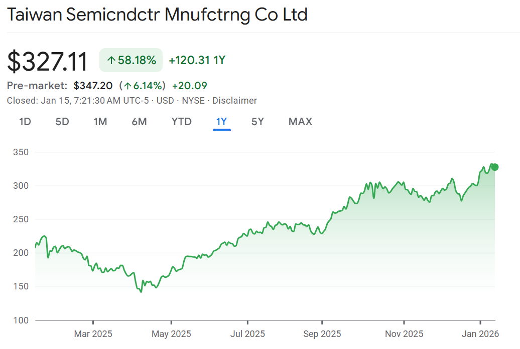 Taiwan minute: Taiwan Semiconductor is popping 6% after a much better than expected quarter that featured a strong revenue forecast on the back of the AI spending frenzy. TSMC says sales in 2026 will grow 30%, better than the 25% analyst expectations. In addition, the company boosted its spending plans to meet AI demand. TSMC is Nvidia’s chipmaker and today’s results are helping to calm investor nerves about the runway for AI spending. The results are boosting ASML in the pre-market, lifting it to a record high and above a $500 billion valuation for the first time.