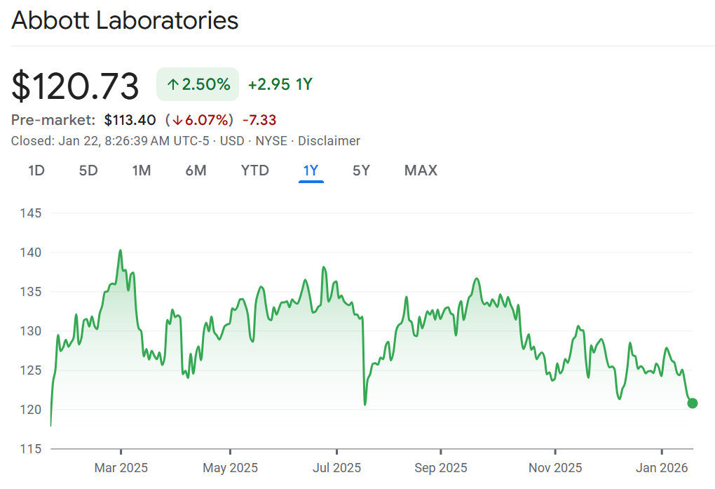 Malnourished: Shares of Abbott Labs are plunging 6% after fourth quarter sales missed expectations and its outlook was weaker than expected due to softness in its nutrition segment. Abbott’s device business continues to wear the decline of Covid testing kits, but its diabetes monitoring tools have become a growth engine. However, Abbott also makes baby formula which has come under pressure following lawsuits alleging it makes premature babies sick. The biggest shortfall this quarter was in that unit with sales coming in half of what was expected. The stock is poised to open at a one-year low.