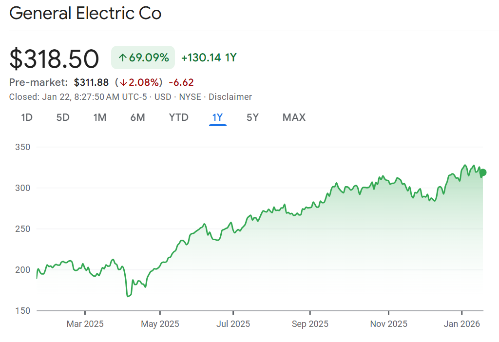 High bar: GE failed to clear a high bar in its earnings and the stock is trading down in the pre-market. The actual results were solid for the aircraft engine supplier: profit, sales and free cash all handily beat expectations. However, the outlook for 2026 suggests sales growth will slow from 2025. Call this nitpicking, because the outlook was higher than consensus estimates. Keep in mind the stock is up 70% over the past year so this could just be an excuse to sell. TD’s Gautam Khanna says the results “should be good enough” and is “likely conservative.” Commentary from GE is also pretty upbeat with the CEO saying they’re not concerned about the demand environment insisting there is “no talk of a slowdown” in airline or defense demand.