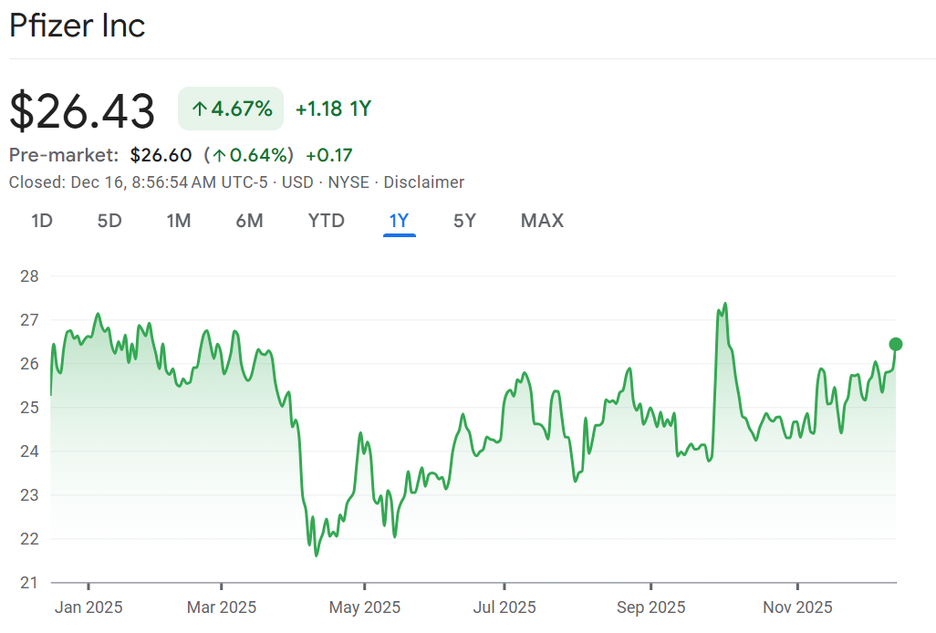 Pflailing: Pfizer is projecting almost no sales growth next year as it works to rebuild its drug pipeline to offset its declining Covid business. Pfizer released its financial forecasts for 2026 which also included continued declines for for Covid related vaccines. The stock has been a dog, down 50% from its Covid highs. Activist attempts have flailed and the CEO has embarked on cost cutting and massive M&A to jumpstart growth. Based on the forecasts, those aren’t expected to majorly pay off in 2026. But with a 6.5% dividend yield and low valuation, I’m sticking this one out.