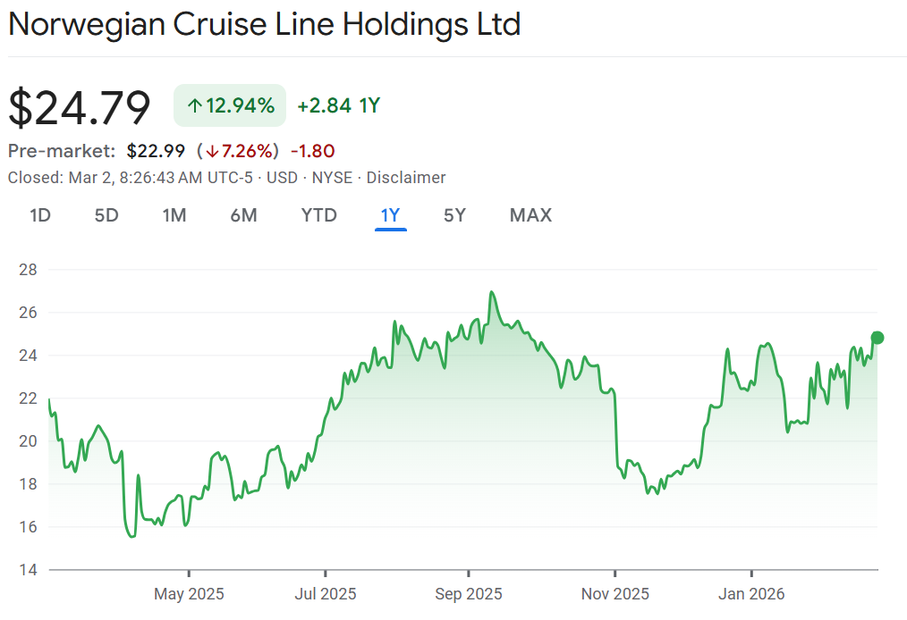 Choppy waters: Norwegian Cruise Line is down 7% on a combination of a risk-off tone from Iran and a weaker than expected forecast. The cruise liner’s profit forecast was lower than expected as advanced bookings on cruises stagnate. This comes as activist investor Elliott Investment Management has been nipping at their heels at their heels. CEO John Chidsey acknowledged there have been execution failures on the conference call with analysts this morning. Chidsey has been in the job for and immediately had to content with Elliott after it disclosed a more than 10% stake and was critical of management and spending in particular. Chidsey said the company has been in touch with Elliott and is interested in their thoughts. Norwegian is the worst performing cruise company in the US over the past two years up only 31% compared to peers which have all more than doubled over that time.