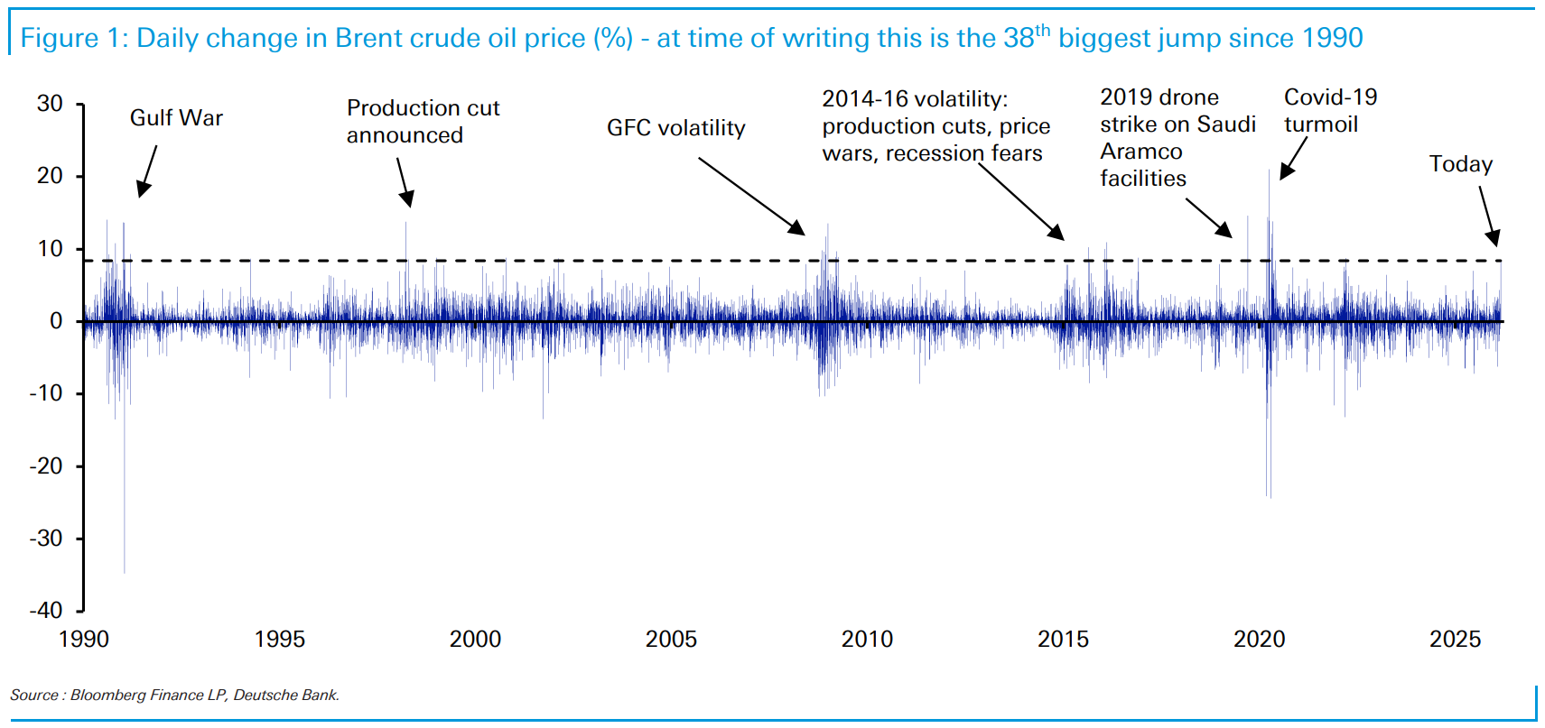 How high do oil prices go? It depends on how the Iran situation plays out and when the Straight of Hormuz – a key shipping channel – opens back up again. “The war between the U.S./Israel and Iran represents the biggest challenge for the global oil market since Iraq’s invasion of Kuwait in 1990,” wrote BMO’s energy analyst Randy Ollenberger, “Speculation that hostilities could break out have supported oil prices by US$5-8/bbl over the last several months. Actual hostilities mean higher oil prices; a spike through US$100/bbl is probable if important oil facilities are bombed.” The closure of the Straight of Hormuz presents challenges beyond crude. About 20% of global LNG goes through the Straight. Nat gas prices are spiking across major hubs. “Disruptions, if they last, could push what had been slowing global inflation the other way and delay any efforts to normalize monetary policy (depending on each central bank),” wrote BMO Economist Jennifer Lee. Below is a look at the price shock in crude. It is the 38th biggest over the last 36 years according to Jim Reid at Deutsche Bank. The fact that gold and oil are ripping could help the TSX outperform today.