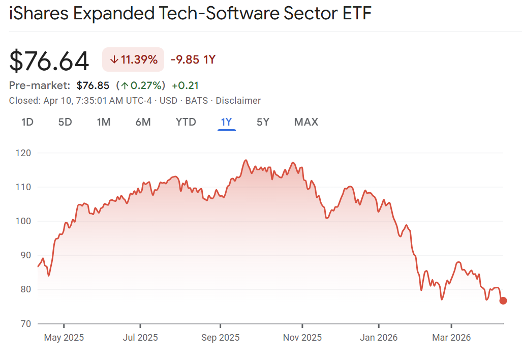 Soft: The S&P 500 software index ETF (IGV) fell to its usual support level of around $76/share for the third time in two months. Anthropic unveiled Mythos, an AI system that is capable of identifying and exploiting vulnerabilities and is said to be so powerful that Anthropic is only releasing it to a handful of companies so it doesn’t fall into the hands of hackers. Reports suggest that Fed Chair Jerome Powell and Treasury Secretary Scott Bessent convened an urgent meeting with top bank CEOs to ensure they were on top of the latest AI developments and potential cyber security threats. Citi’s Tyler Radke is warning that pressure on software stocks is likely to only intensify in the coming months. He now only rates about 50% of his software coverage a buy after downgrading six stocks: Similarweb (SMWB), CCC Intelligent Solutions (CCC), DocuSign (DOCU), NICE Ltd. (NICE), Veeva Systems (VEEV), and Autodesk (ADSK). “We believe most of these are good companies, and may be well positioned long-term, but don’t have exciting 12-month catalysts,” wrote Radke. The sector has already faced significant pressure down 27% so far this year, but Radke warns the worst is not over. “While software stocks have faced significant pressure…we would argue Q4 fundamentals were quite strong,” he said, “…Heading into Q1, we see a tougher set-up given typical seasonality issues, and more cautious checks and our CIO survey, which suggest softer IT budgets, greater software consolidation pressure, all against inflecting AI revenue at labs/privates (Anthropic, OpenAI etc.).” He still likes Shopify, Microsoft, MongoDB, Snowflake and Palantir noting they have “clearer growth trajectories.”