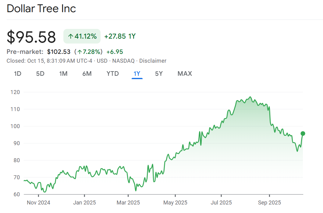 Money Tree: Dollar Tree is popping 7% after same-store sales beat expectations and it forecast sustained profit growth for the next three years. Earnings per share are now expected to grow in the high teens on the back of cost cutting measures. The dollar store operator in the US ditched its struggling Family Dollar brand earlier this year selling it for $1 billion, far less than the $9 billion it paid for it 10 years ago. The company is in the middle of a big turnaround with most of the executives, including the CEO, in their roles for less than a year. Tariffs remain an uncertainty and the stock has struggled to go back to its highs from a few years ago. Having said that, it has been working as a turnaround play with the stock up 27% so far this year.