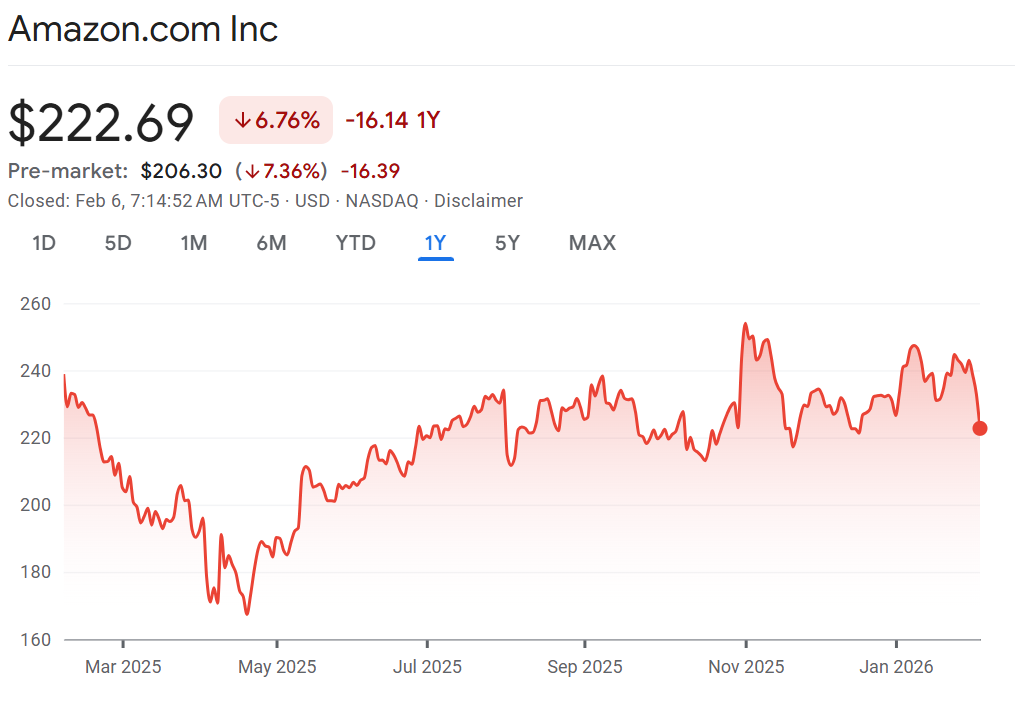 River runs red: Jeff Bezos named the company Amazon after the biggest river in the world to signify the scale of the company’s ambitions. Today, the company is earning its moniker announcing $200 billion in new spending plans – $50 billion more than expected. Amazon shares are down 7% in the pre-market as the higher spending overshadows solid quarterly results. Revenue grew 14% better than expected while its cloud business (Amazon Web Services) grew 24%, the best pace of growth since 2022. The problem is that all this spending will take a bite out of profits. Indeed, the spending plans that Amazon will have negative free cash flow this year (Meta, Microsoft and Google’s spending out of operating cash flow). “The AMZN (return on AI) proof-points are in its AWS results, and AMZN is doubling down,” wrote Evercore’s Mark Mahaney, “We agree with this strategic move. We just don’t like the near-term evisceration of FCF (we estimate approx. negative $10B in FCF in 2026).” Mahaney believes the stock will be range-bound until the market sees potential for free cash flow snapback and/or revenue acceleration this year. I own Amazon.