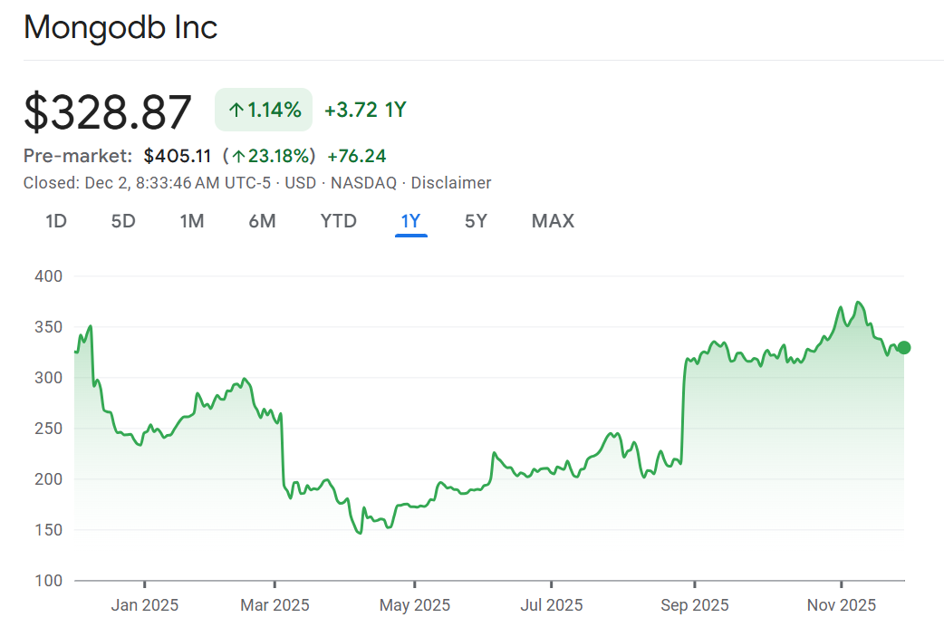 Mongo move: Shares of MongoDB are surging 23% after beating profit expectations and boosting its forecast. The database software company saw a big surge in its ready-to-use database platform, Atlas, with sales surging 30% from last year. This is a feather in the cap of new CEO CJ Desai who came in less than a month ago. This marks a significant shift from earlier in the year when the company was missing expectations and cutting forecasts. Atlas now makes up a significant chunk of total revenues and the CEO Desai says it is well positioned for AI.
