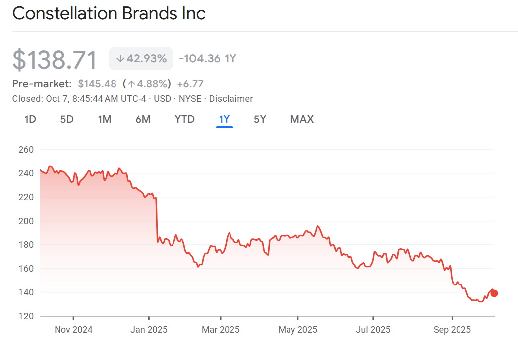 Drink to that: Constellation Brands is up 5% after results came in better than feared. Profit beat expectations but was lower than last year and sales dropped 15%, but that was better than feared. The maker of Modelo and Corona already warned at the beginning of September that results would be disappointing due to soft consumer demand, particularly among Hispanics which is a large consumer base for the company, and tariffs. The stock has been plumbing around the lowest level in 5 years. Investors are taking comfort that margins on beer sales were also better than expected.