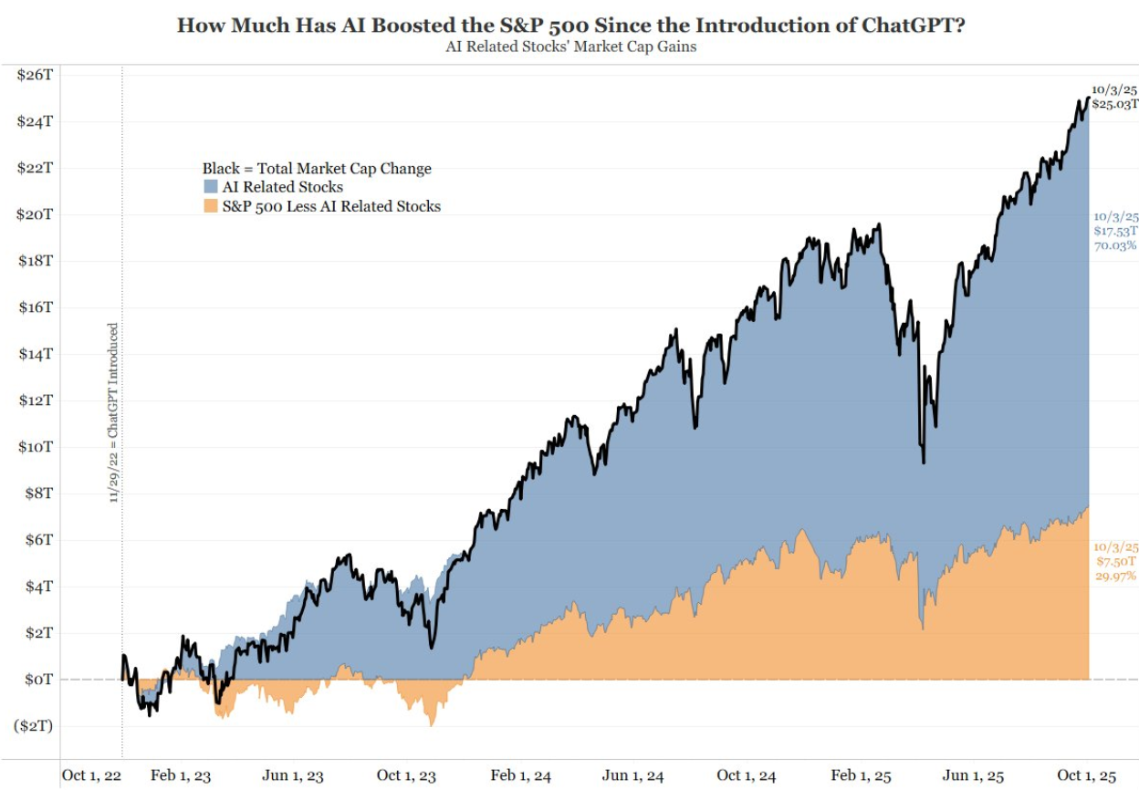 AmAIzing: Futures are taking a breather after a another record run for the S&P 500, TSX and the NASDAQ. The Dow Jones Industrial Average fell as Nvidia slipped in favour of AMD’s huge surge yesterday. Tomorrow will mark 6-months since the tariff tantrum low in the markets. Since then, the TSX and the S&P 500 are up 35%. On the TSX, just 12 stocks are in the red since April 8th. Everything else is up. It’s roughly the same for the S&P 500 with less than 100 names in the red since the low. It is really hard to have an ugly portfolio right now. For some, that is a concern. We are at the point in the cycle where a mere mention by Sam Altman on stage leads to a stock rally (Figma +7% yesterday after it was mentioned at a developer event). There is no doubt that AI has been a driving force over the last couple of years. Since the release of ChatCPT, 41 AI related stocks have accounted for 70% of the increase in the value of the S&P 500 according to JPMorgan (see chart below courtesy of Larry McDonald at Bear Traps Report). The rest of the 30% gain is from 359 stocks. The US shutdown is entering it’s seventh day but President Trump is still working. He will receive Prime Minister Mark Carney in Washington this morning. This will be his second trip. The first one went well and the stakes are high for this one considering the review of NAFTA 2.0 begins next year. Canada is the only G7 country yet to reach a trade deal with Trump this year, in part because it has NAFTA 2.0 in place and benefits from carve outs.