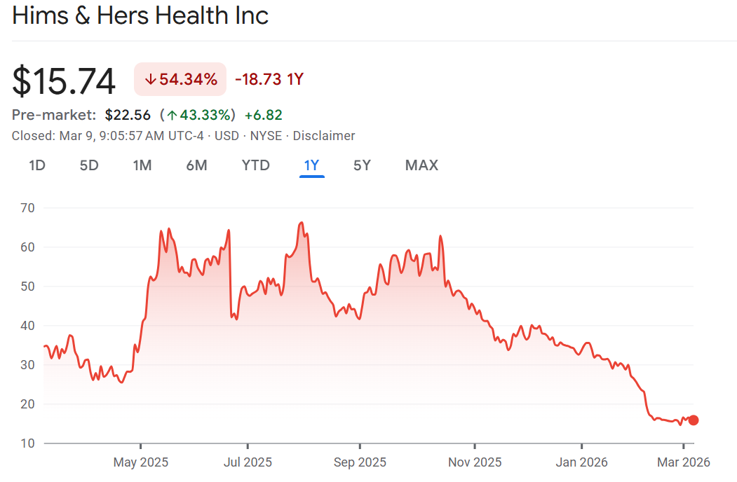 Frenemies: Novo Nordisk and Hims & Hers are ending their feud announcing they will sell obesity drugs together. Shares of Hims & Hers are surging 44% in relief they will be able to sell Ozempic and related drugs again. This comes after a very public breakup in which Novo accused the telehealth platform of selling a knock-off version of their drug on the platform. Now they are making up as Novo has been hobbled, losing market share to Eli Lilly’s Mounjaro. Shares are Novo are up 2% in the pre-market but have lost over 50% in value over the past year.