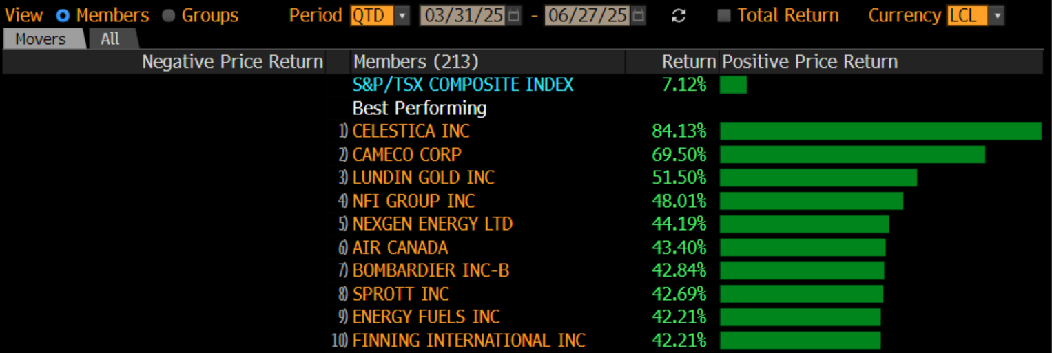 Back nine: Today marks the last day of the first half of the year. US markets wrapped up a quarter which saw a near bear market and an abrupt pivot to one of the most stunning rallies in history. The caveat of course is that valuations are now back to historical highs on the S&P 500. That doesn’t mean things can’t get more expensive, especially if the focus moves from trade wars to tax cuts. The TSX has fared much better so far in 2025 and is up a robust 8%. While we know that gold stocks gave us a head start with a huge rally in Q1, some of the best performers in Q2 were the laggards in Q1. Shares of Celestica, Cameco and NFI Group are some of the best performers in the last three months.