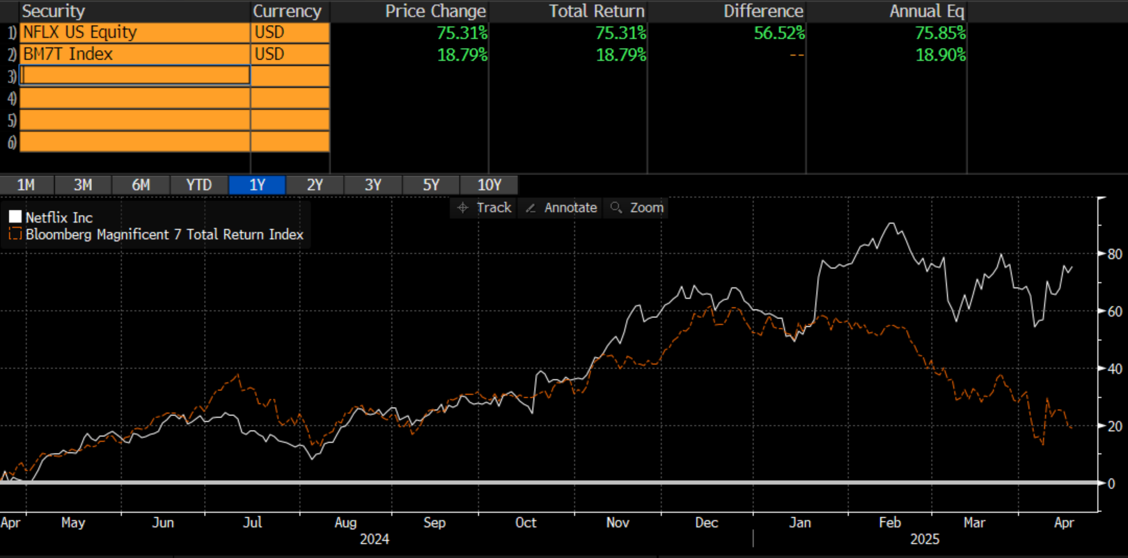 Netflix and chill: Shares of Netflix are popping 2% against a difficult tape after reporting better than expected results Thursday after the close. The streamer reported higher sales growth than expected and its forecast growth in the next quarter was also above consensus. Impressively, Netflix also put up record operating margin. Netflix isn’t part of the Magnificent 7, but its stock has been nothing but. Netflix is up 75% over the past year while the “Mag7” is only up about 19%. “We think investors have turned to (Netflix) as a recession-resilient haven amid macro uncertainty,” wrote Evercore’s Mark Mahaney, “and Q1 results and commentary reinforced the view that (Netflix) is well positioned to weather a tariff-driven macro slowdown.”