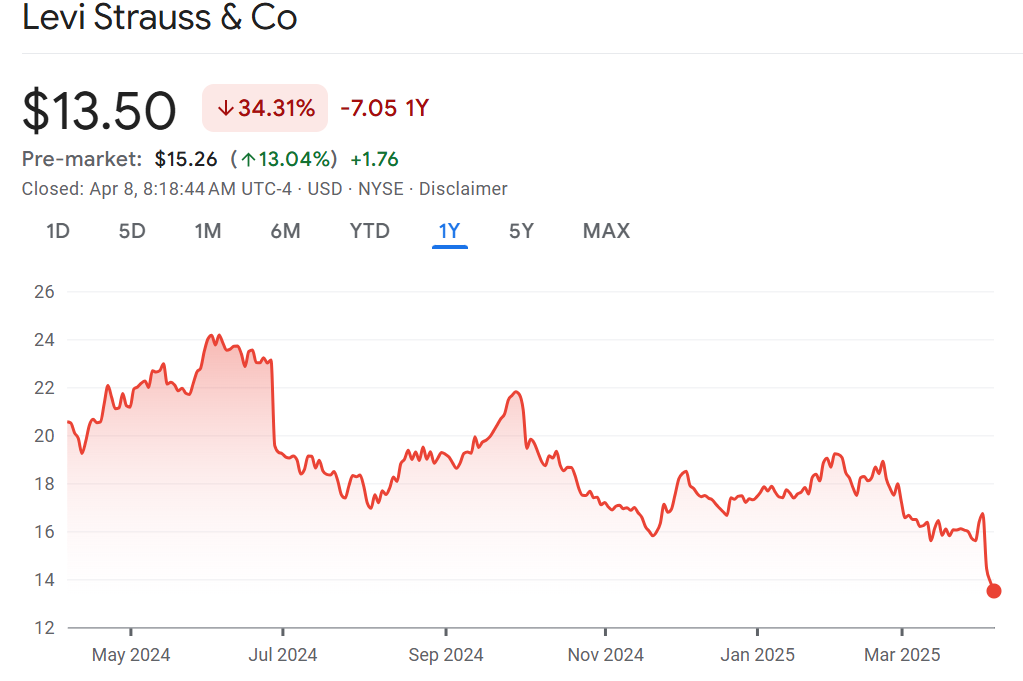 Snap a picture, bring it on: Shares of Levi Strauss are bouncing off a one-year low surging 13% in the pre-market. The iconic jeans maker is the first retailer to report results after the tariff announcements and for now says it should have “minimal impact.” Analysts aren’t so sure about that. “Levi isn’t immune to cost shocks or consumer slowdown,” wrote Stifel’s Jim Duffy. Levi maintained its full-year sales forecast calling for 3.5% to 4.5% growth this year. However, that does not include the impact of tariffs. “Uncertainty outweighs progress,” wrote Morgan Stanley’s Alex Straton, “Levi provided little/no tariff clarity.”
