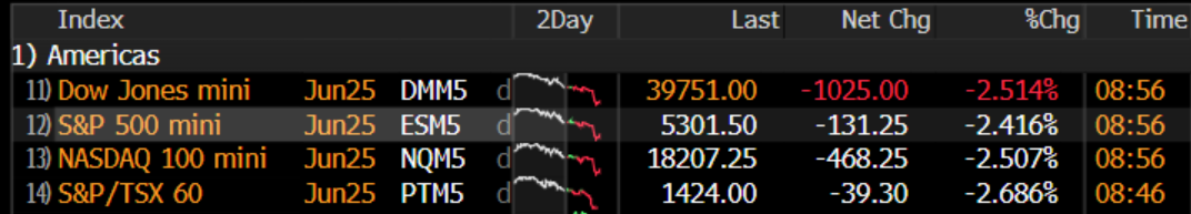 The damage: Futures are plunging and threatening to rival the historic declines we saw yesterday. Dow futures are shedding another 1,000 points this morning while the S&P 500 and the NASDAQ are indicating a 2.5% drop. This comes as the S&P 500 plunged to the lowest level since September and fell the most in 5 years. The NASDAQ is on the verge of a bear market. The TSX is faring a little better with the index just 6% lower from its January all-time high. Under the hood things are messy. 75% of S&P 500 stocks are down 10% or more from their 52-week high, while 53% of stocks are in a bear market (20% pullback or more). On the TSX, 67% of stocks are down 10% or more and 40% are in a bear market. The volatility index is at the highest level since the pandemic. Commodities are getting crushed with oil plunging to the lowest level since 2021 trading at $62/bl. The safe haven trade has been in bonds and one can’t help but observe that the yield on the US 10-year has now fallen below 4% which is the lowest level since October while shorter-term debt is at the lowest level since 2022. If I was a country, say the United States, that was spending about 20% of my federal revenues on interest expense, I might be delighted that this economic slowdown I’ve engineered is going to lower my interest payments and allow me to refinance at lower levels. We will hear more about the path of interest rates today when Fed Chair Jerome Powell speaks at 11:25amET today. No doubt whatever speech he prepared at the beginning of the week has been ripped to shreds and new thoughts were formed after April 2nd.