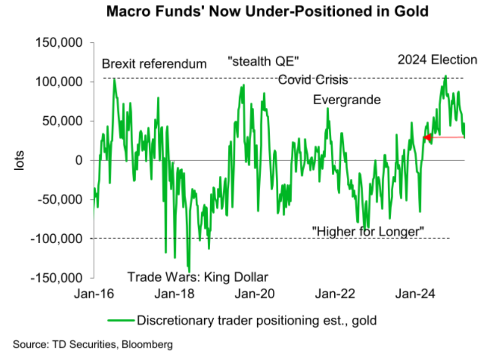 Haven: Gold prices have been in the red since the tariff announcement, although on a relative basis not down as much as stocks (down about 2%). TD is out with a note this morning that says it could be because gold was overbought at these levels. However, they note that gold is still “under-owned” by funds (see chart below.) “Overall, gold remains significantly under-owned, mitigating downside risks. Seek shelter in the yellow metal’s warm embrace,” wrote TD’s commodities team. This is a sentiment shared by Dan Dreyfus who says he sees a scenario where gold can hit $4,000/oz.