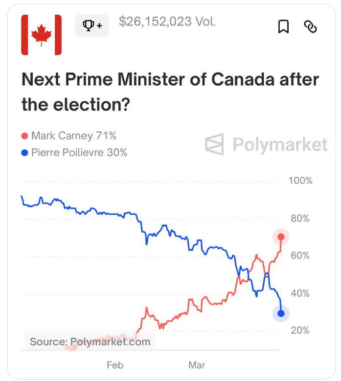 Fourth time is a charm: Polling indicates that the Liberals have an edge over the Conservatives with less than a month until the federal election. This means the Liberals under Prime Minister Mark Carney could be headed to a fourth term. Polymarket, a prediction market, says there is a 71% chance Mark Carney will become the next Prime Minister. In an effort to come back from this setback, Conservative leader Pierre Poilievre said that any company that reinvests their proceeds in Canadian businesses would be able to defer taxes on any capital gains between July 1, 2025 and December 31, 2026. If the measures are successful, the Conservatives would make the changes permanent. “If this passes, it meaningfully changes the math of owning Canadian stocks vs anywhere else in taxable accounts,” wrote Ernest Wong, Head of Research at Baskin Wealth.