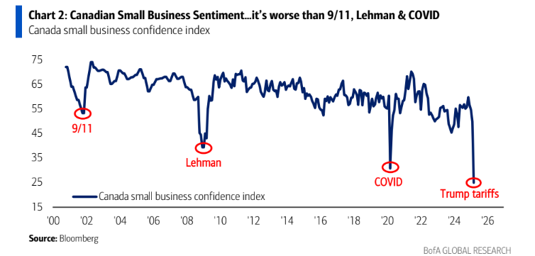 March sadness: US futures are indicating a lower open after a weak session yesterday. Earnings from giants like Nike and FedEx have the overall market in a funk as they warn about the impact of tariffs on their bottom line (more on that below). Depending how the day goes, the S&P 500 could slide for the fifth week in a row. The TSX has fared slightly better but has still been bogged down by tariff concerns. Indeed this may be the vibe until April 2nd when the White House has promised to reveal the full arsenal of their tariff war chest. “Everyone thinks April 2nd will be ‘peak fear’ day, but I guess that will really depend on whom he is playing golf with on April 1st,” wrote Bank of America’s Michael Hartnett saying that the deadline is starting to “infect” global data. One of the examples he gives is Canadian small business sentiment. As you can see below, it is worse than other previous crisis points including 9/11, the 2008 financial crisis and COVID.