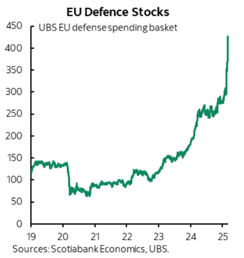 De-fense! De-fense! De-fense!: Defense stocks are surging in Europe as it is clear that Europe will need to invest in the sector because it may not be able to rely on US strength. I’ll trust that we’ve all seen that press conference between Trump, US Vice-President JD Vance and Ukrainian President Volodymyr Zelenskyy. If you haven’t, let’s just say it went off the rails. Aerospace/defense stocks are surging as investors anticipate higher defense budgets throughout Europe (Airbus, BAE Systems, Dassault Aviation, Leonardo, Rheinmetall, Rolls Royce, Saab, and Safran are among the top stocks in Europe).