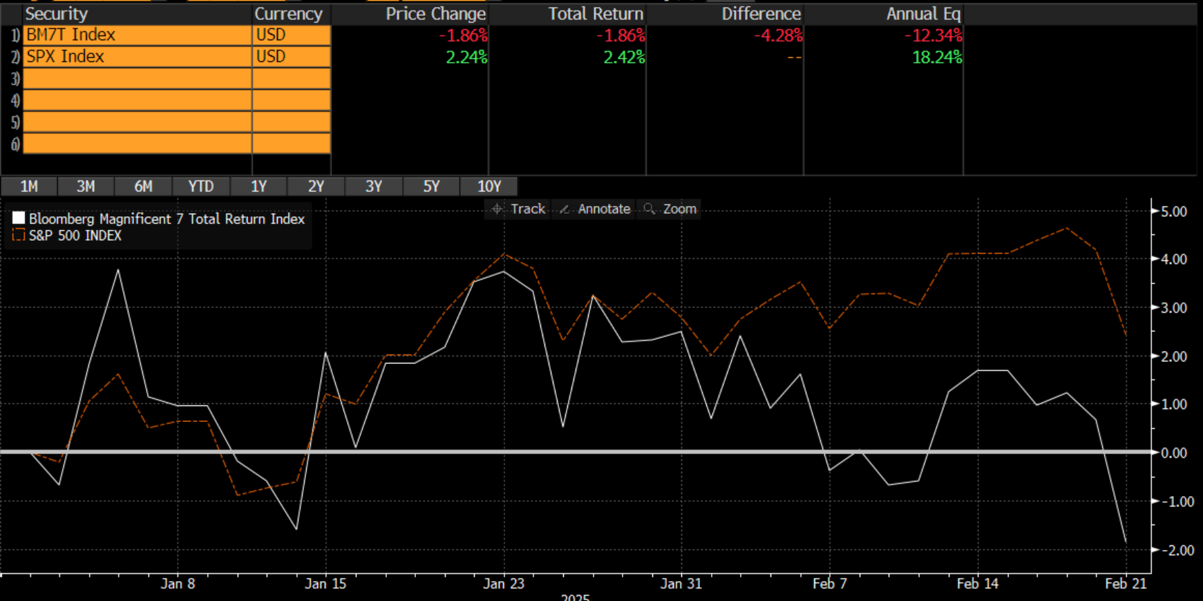 Lag 7: The Magnificent 7 is now officially in the red for 2025. The group of seven stocks that comprise of Alphabet, Amazon, Apple, Meta, Microsoft, Nvidia, and Tesla is now down nearly 2% for the year. Only Meta is up strongly this year with a gain of 17%. This morning, shares of Apple are down slightly after the smartphone maker unveiled a plan to spend $500 billion in the US over the next four years and create 20,000 jobs. No doubt this is a reaction to pressure by the Trump administration to build in the US or face tariffs on overseas production. It also happens to look nearly identical to an announcement Apple made in 2021 to spend $430 billion over 5 years. Microsoft says they still plan to spend $80 billion on AI infrastructure this year after a report from TD Cowen said their channel checks indicated that Microsoft was cancelling data centre leases. TD Cowen warned this could be because Microsoft is worried about being in an oversupply situation. This would be music to the ears of AI bears. The stock initially dipped but has now recovered after Microsoft reiterated its spending intentions and said they may shift priorities regionally but the overall spend is in tact.