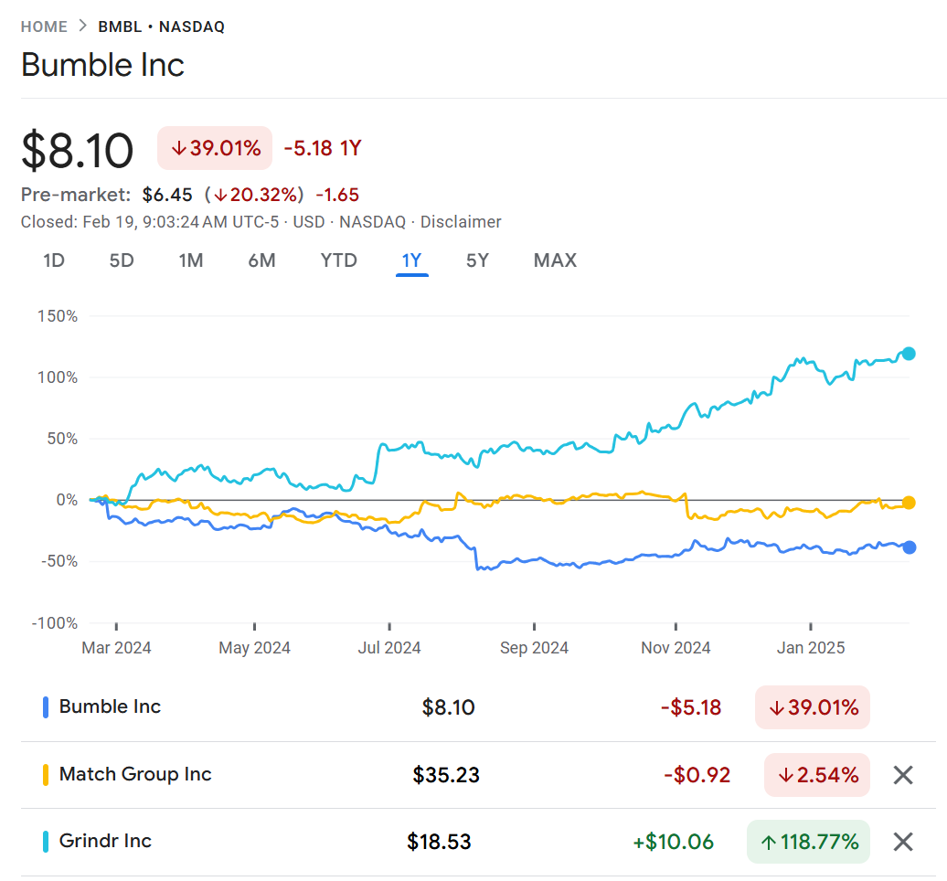 Tumble: Investors are swiping left on dating app Bumble with shares plunging 20% in the pre-market and poised to open at a 5-month low. Total sales fell 5% from last year but the company is warning investors that sales next quarter will fall even more. Bumble says sales could drop between 7-10% next quarter, worse than the 6% decline expected. Bumble went public during the 2021 IPO heyday and is down nearly 90% from the peak. It has been a massive underperformer compared to the likes of Match (which has also struggled) and Grindr (which has doubled).