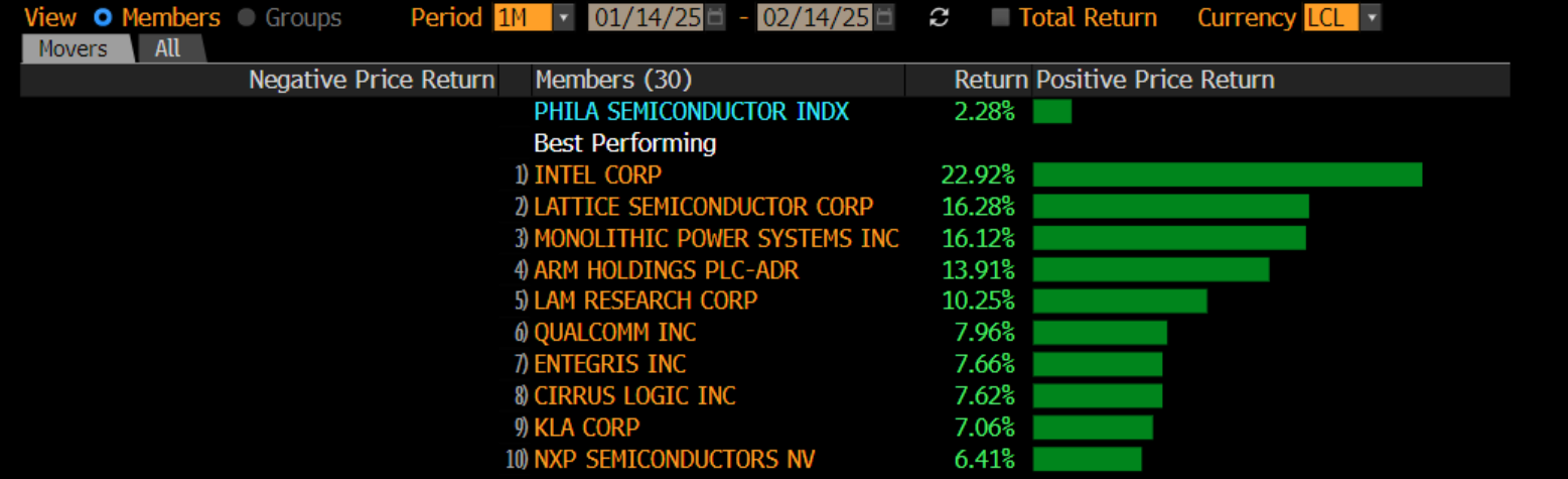 Head(line) fake: If I could sum up the markets so far in 2025 it would be: the worse the headline, the better the performance. Tariffs ushering in a new world order and possible Great Depression? Canadian and US markets are spitting distance from all-time highs. China in the midst of a slowdown and on America’s bad side? The Hong Kong markets are one of the best performing in the world so far this year (+14.5% in 2025). This doesn’t just apply to broad markets. The top performers are a who’s who of negative headlines. Palantir is one of the least loved AI stocks on the planet with just 5 buy ratings compared to 13 holds and 6 sells. It is also the best performing stock on the S&P 500 so far this year (+58%). Super Micro is at risk of being de-listed from the NASDAQ, was accused of fraud by a short-seller, and didn’t file its financial results on time. It’s the second best performing stock of 2025 (+57%). CVS dropped 40% last year to a 12-year low and ousted its CEO. It’s the third best performing stock (+47%). Amongst the chip stocks, Intel has been trailing in last place for a while but it’s the best performing semiconductor over the past month (more on that below). This worst-is-first mentality is showing up in Canada. BlackBerry is the best performing stock on the TSX (+47%). Headline after headline highlighted TD’s anti-money laundering woes. It is the best performing bank stock. While each of these stories are idiosyncratic, they are all part of the same trend. The markets are incredibly resilient despite headlines that tell us otherwise. Why? Part of it is that investors are looking through tariffs and focusing on other facets of the Trump administration like tax cuts and deregulation, says Evan Mancer of Cardinal Capital Management on the podcast. He says this is the consensus trade right now. What about elevated inflation in the US? Bank of America says its a “blessing-in-disguise” for stocks and bonds. “Rising inflation means Trump must go ‘small’ not ‘big’ on tariffs & immigration in coming months to avoid fanning 2nd wave of inflation,” wrote Michael Hartnett of Bank of America in a note on Friday. This works well enough for me. While I stopped dating garbage in my late 20s (when I met my husband), I still keep a fair bit of it in my portfolio (I own Intel, CVS and just exited BlackBerry).