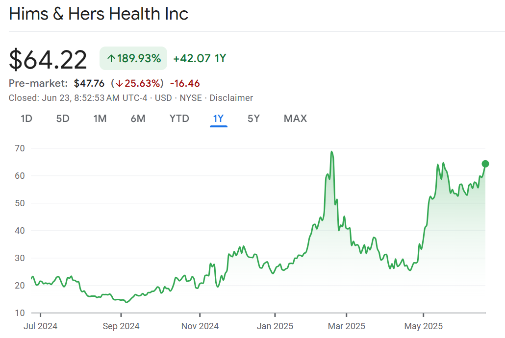 Cutting ties: Shares of Hims & Hers are plunging 25% after Novo Nordisk says they will cut ties with the tele-health platform. The company has rode an insane wave on the back of Ozempic and other weight-loss drugs like Novo’s Wegovy. The the stock is up 165% so far this year. This morning Novo Nordisk says they are no longer going to supply them because of “deceptive marketing” and “knock-off versions of Wegovy.” Novo partnered with Hims just two months ago and is a big part of the reason the stock went up. It’s a big win for the shorts, with 34% of the shares outstanding short.