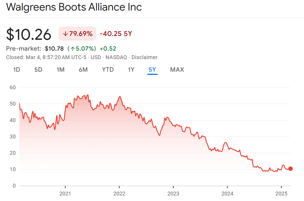 Life line: Walgreens is surging 5% on reports it is nearing a deal to be bought by private equity firm Sycamore Partners. The struggling pharmacy chain would be bought for $11.30-$11.40/share according to the reports. That is barely a premium to where the stock traded just last month and well off where it was last year when it was a $20/share stock. However, perhaps investors are looking to be put out of their misery with the stock losing nearly 90% in value over the last 10 years.