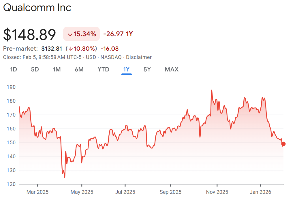 Traumatic memory: Qualcomm is plunging 10% after the chipmaker posted a weaker forecast than expected. The supplier of chips to smartphones warned the supply shortage of memory chips and soaring prices are weighing on demand. Phonemakers can’t get their hands on the memory chips needed to complete a phone, so they make fewer phones, which means less demand for Qualcomm chips. Memory chip prices have also soared, meaning the phonemakers are feeling the pinch and that also weighs on demand for Qualcomm chips. Qualcomm is trying to diversify into AI, computers and cars, but handsets are still their bread and butter. The company got hit with three downgrades on the back of results: Bank of America, Morningstar and Susquehanna all threw in the towel on their buy rating.