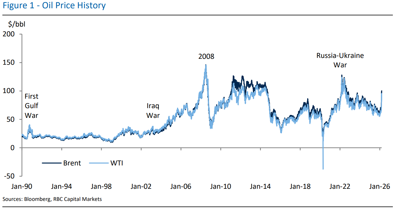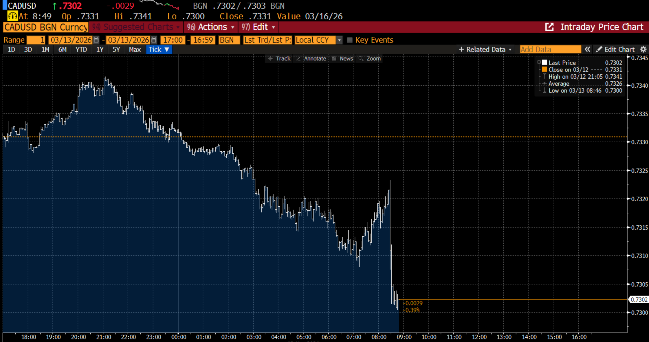 Correction: US markets are in the green this morning as crude oil slips. It’s hard to see a situation where that remains given the ongoing conflict in the Middle East. Oil prices could breach their 2008 highs, warns noted commodity strategist Helima Croft of RBC in a note to clients this morning. “We believe that we will exceed the Russia/Ukraine oil price highs of $128/bbl in 2022 if the war continues for another three to four weeks with minimal progress on maritime security,” she wrote, “And that we will surpass the 2008 peak of $146/bbl if it extends for several more months.” Her conversations with sources in DC suggest we could see the war drag out with boots on the ground. Is this priced in? The S&P 500 is down 4% from its record high. Somehow the TSX has fared worse, down 5% from its record high largely because gold has sold off since the war taking down precious metal stocks while energy stocks have barely rallied. This morning we got a read of US inflation that was inline with expectations while consumer spending was tepid. Both reports pre-date the Iran war and are not likely to be informative for future policy rates.