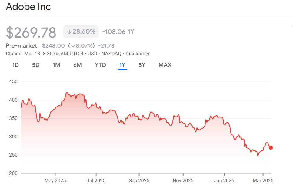 Airbrush: Shares of Adobe are plunging 8% after a drop in annual recurring revenue and the surprise announcement the long-time CEO will be leaving. While revenue and profit exceeded expectations, annual recurring revenue declined 11% from last year. This raises questions around near term demand, says Tyler Radke of Citi. “The announced CEO change adds another layer of uncertainty at a delicate moment in the story, as Adobe navigates a rapidly evolving AI and competitive landscape.” Adobe has struggled as investors worry that free image tools through LLMs like Grok or ChatGPT are going to reduce demand for paid offerings by Adobe. Having said that, revenue growth in the quarter was the strongest since Q3 2022. Barclays isn’t recommending you chase this one lower, downgrading Adobe following the results and the CEO departure.