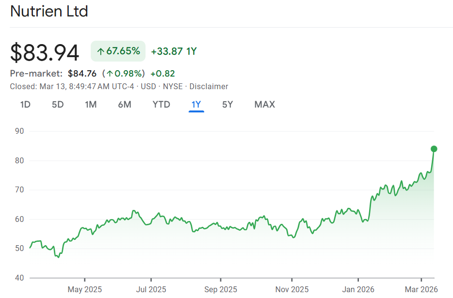 Fertile ground: Nutrien is catching another upgrade this morning, this time at Wells Fargo. Recall, yesterday Jefferies upgraded the stock. Similar to that upgrade, Wells is upgrading based on the conflict in Iran which has pushed up fertilizer prices. Chemical stocks have been on a tear with shares of Mosaic, CF Industries, Nutrien and Methanex getting swept up in the trade.