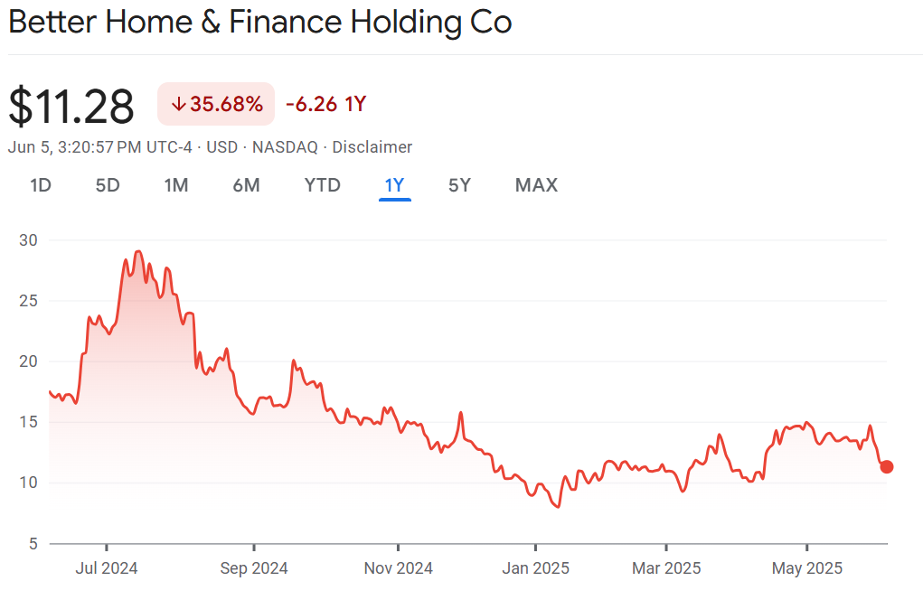 Better Home & Finance (BETR) is a mortgage origination company that leverages AI to streamline the lending process, offering 24/7 loan officers and rapid rate locks. Since its 2021 peak, when it originated $50 billion in mortgages, the stock has collapsed to $0.20 (2% of its $10 SPAC issuance price) after a 500-for-1 split. The drastic decline reflects a 95% drop in origination volume to $3.5-4 billion last year, driven by rising rates and a competitive direct-to-consumer model. A high-profile mass layoff and SoftBank debt further damaged sentiment, raising concerns about cash burn and solvency.