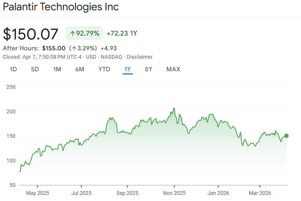 Dual-platform company with Gotham serving government and defense, and Foundry delivering enterprise AI solutions. Currently down about 30% from its October peak.