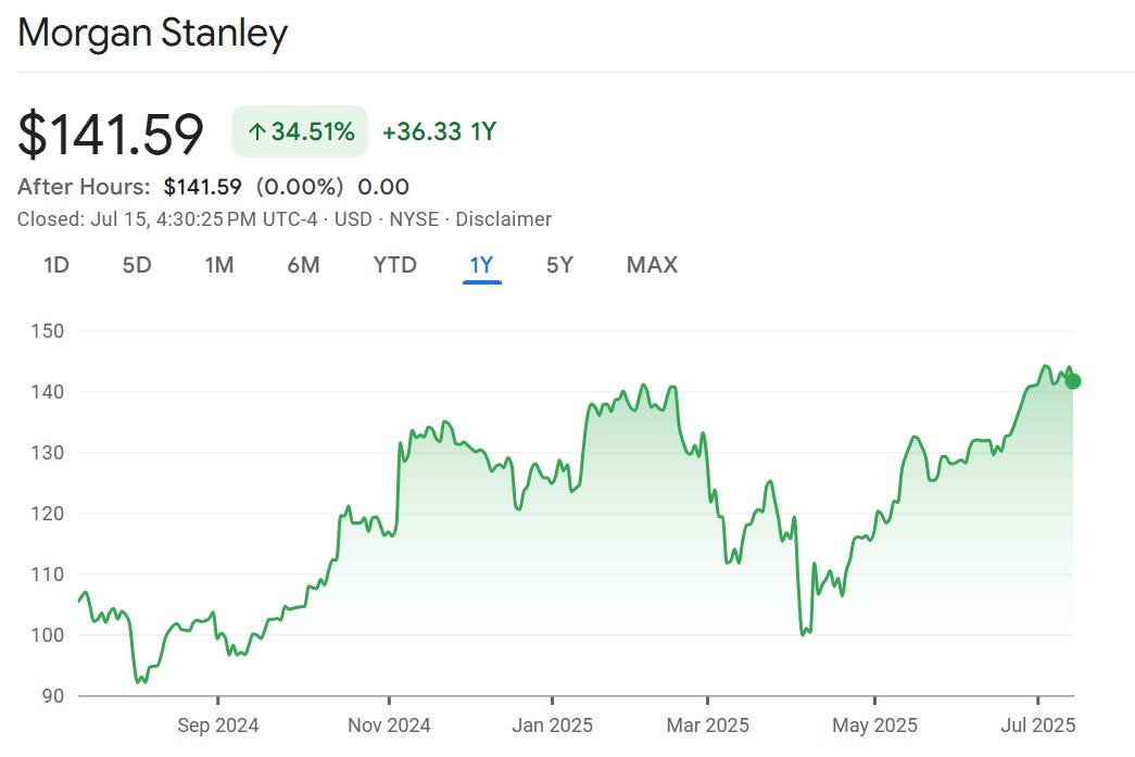 - Wealth Management Strength: Managing $5 trillion through acquisitions like E-Trade and Eaton Vance, Morgan Stanley’s wealth management arm (35% of revenue) delivers stable, less volatile income.