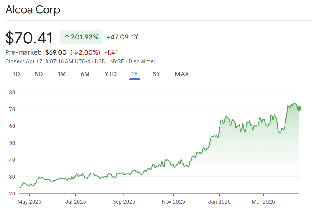 Tin can: Alcoa is falling as quarterly results showed it failed to capture higher aluminum prices due to the war because of higher costs and operational disruptions. Profit and sales both missed expectations. The Middle East produces about 9% of the worlds aluminum and the war has driven up prices. Alcoa was unable to capture that because higher energy prices drove up their transportation costs. In addition, the other part of its business which refines alumina has been disrupted by the inability to access key inputs. Keep in mind the stock has also run up into the quarter +32% so far this year.