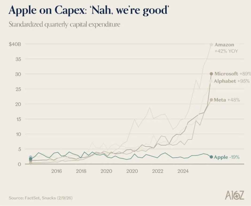 Johnny Apple Seed: Apple surprised the markets announcing Tim Cook would step down as CEO this summer and John Ternus would become the new CEO. Cook will still be around, becoming Chair of Apple. Over the course of 15 years, Cook took Apple from a $350 billion company to a $4 trillion company. Revenue went from $108 billion to $466 billion this year and its services business went from non-existent to $123 billion in sales. His greatest triumph was around supply chains and logistics keeping China on the company’s no matter the state of relations with the US government. Ternus was the head of hardware before being tapped to become CEO and has been with the company since 2001. His appointment comes as AI has burst onto the scene and Apple doesn’t seem to have a player in the game. Indeed it has been an outlier with spending going DOWN, while others are blowing their budgets in the AI race (see chart below). With his hardware background, perhaps this signals that Apple will remain a hardware-first business. “There are many opportunities for Ternus to define his own path and the future success of Apple out of the gates,” wrote Dan Ives of Wedbush. Chief among them will be to define a clear strategy in AI. “We can’t say it enough but Apple cannot watch the AI era from the sidelines as this 4th Industrial Revolution takes hold. In essence, Apple is a toll collector on the consumer AI highway and Ternus needs to finally get the AI strategy right and focus on monetization going forward,” said Ives. He also argues that Apple should be more aggressive with M&A because it has the cash and the brand to do so. Apple’s World Wide Developer Conference in June could be the first opportunity for Ternus to set the tone of his tenure.