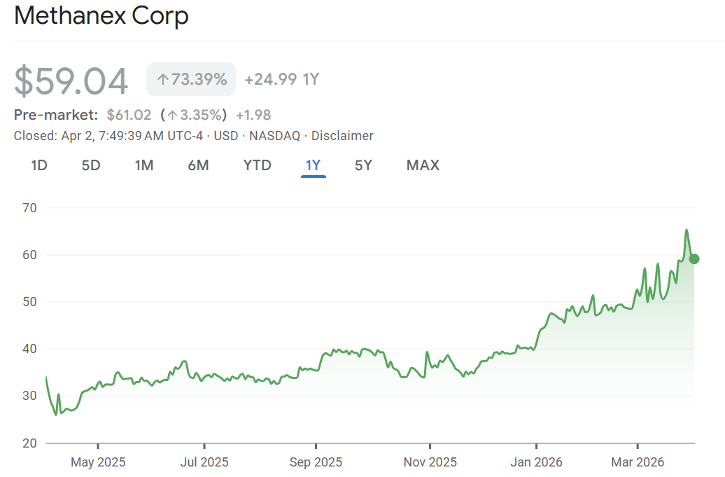 Calling the top: RBC is downgrading Methanex after a 50% jump in shares this year catalyzed by the Iran war and supply disruptions. “The shares are increasingly becoming linked to the ongoing Iran conflict,” wrote RBC’s Nelson Ng, “Once the Iran conflict is resolved, we believe methanol prices could quickly normalize.”