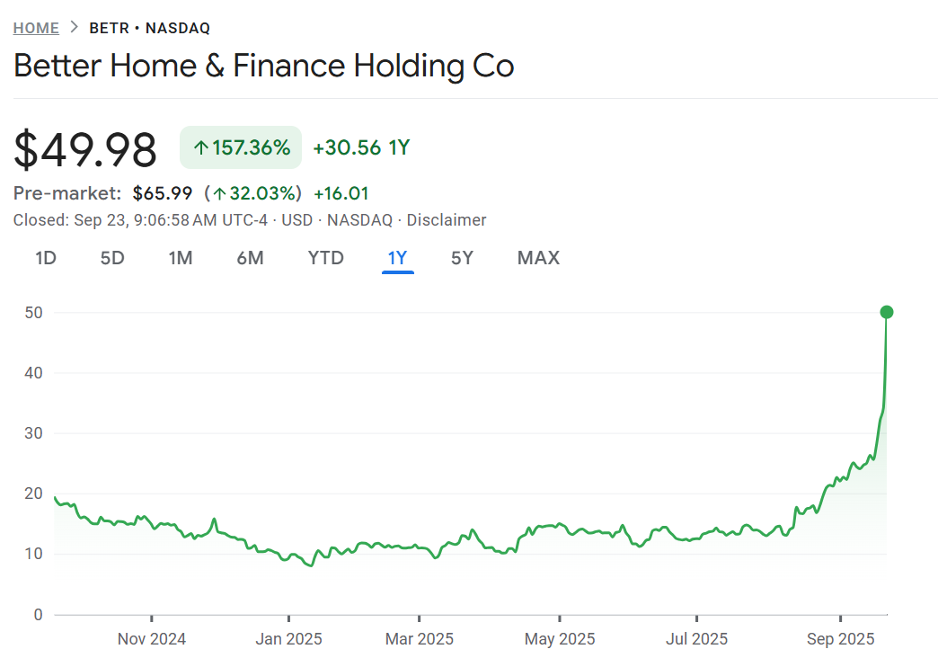 Better gets better: Shares of Better Home & Finance surged more than 45% yesterday after newly minted meme lord Eric Jackson said it was his next big idea. It is up another 36% in the pre-market and has already been halted for volatility. Recall, Jackson is leading the Opendoor army hoping to revive the embattled home sales platform. So far Opendoor is up 975% since he announced his position in July. Opendoor fell 12% yesterday presumably on concerns that Jackson has a new shiny object to play with (which he refuted on X saying when your wife has another child you don’t stop loving your existing children). Anyway, now he is all-in on Better which is an embattled mortgage lender that he calls the “shopify of mortgages.” Faithful listeners of the podcast will recall three months ago when Daniel Lewis of Orange Capital touted this as one of his Pro Picks. That’s when I picked it up and have been a happy shareholder! Eric Jackson will come back to the podcast next week! If you’ve got a question for him send them to questions@inthemoneypod.com